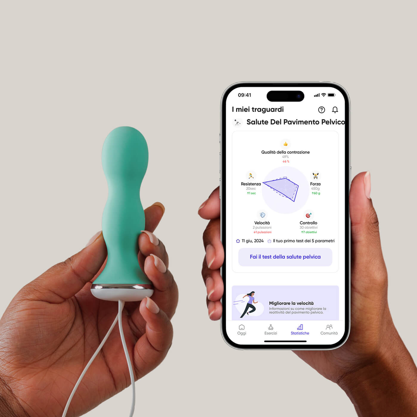 Le soluzioni Perifit sono costituite da un dispositivo e da un'applicazione che insieme formano una piattaforma interattiva per guidare l'utente negli esercizi di rafforzamento del pavimento pelvico.