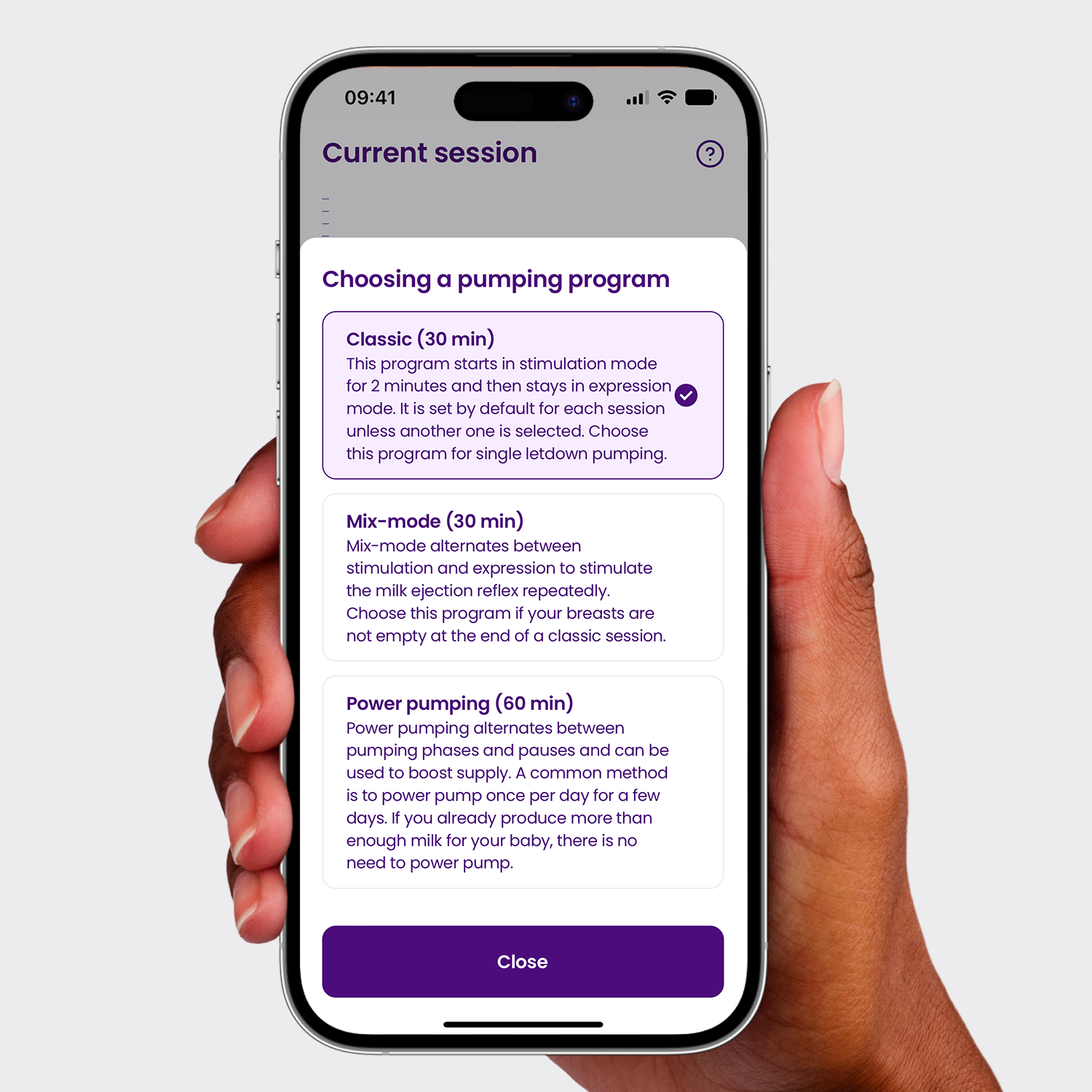 Ottimizza le tue sessioni scegliendo il programma di allattamento al seno più adatto ai tuoi obiettivi di pompaggio.