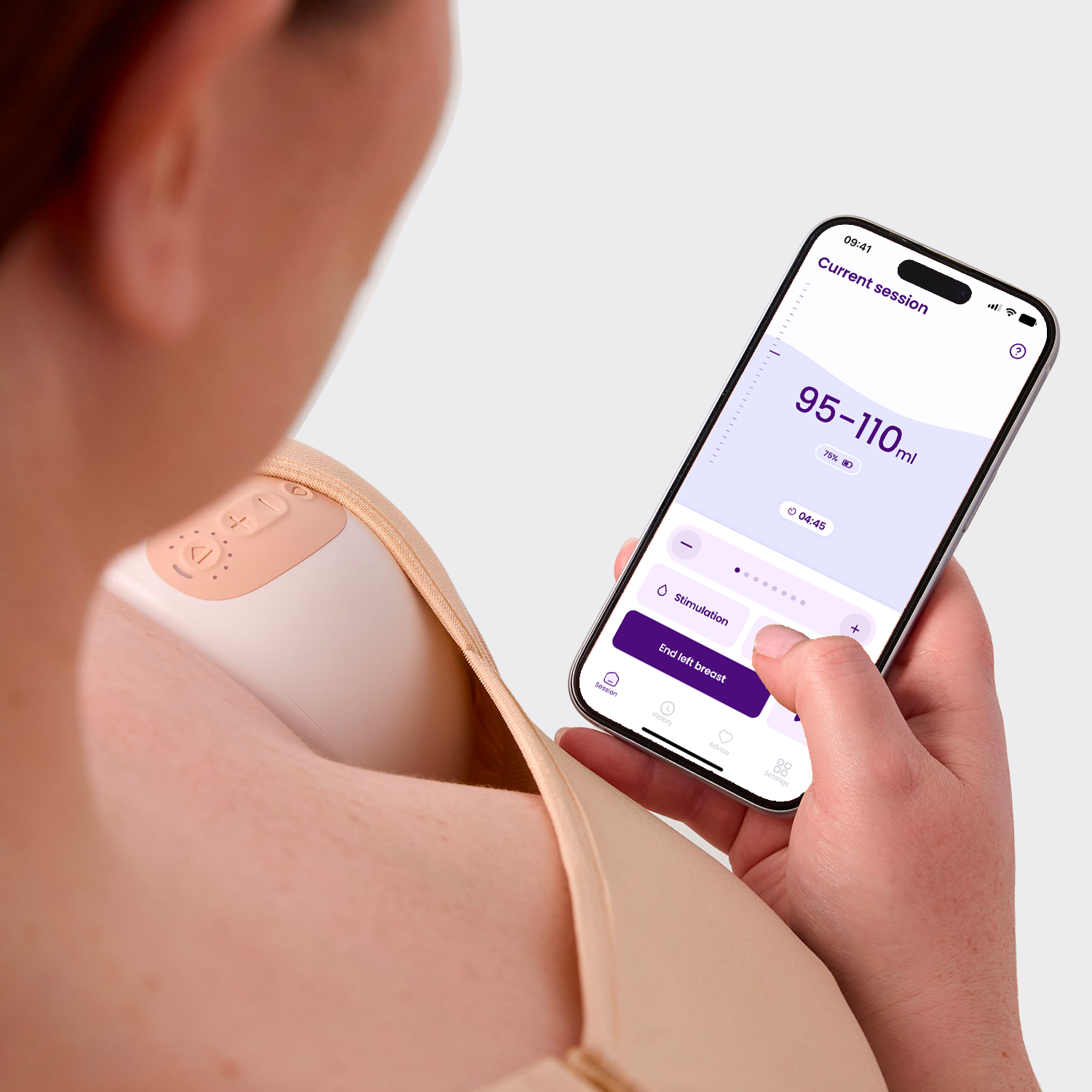 L'involucro contiene un potente motore, un'esclusiva tecnologia di cancellazione del rumore, il rilevamento automatico del livello di latte e la connettività Bluetooth per monitorare, controllare e ottimizzare il tiralatte dall'app gratuita.